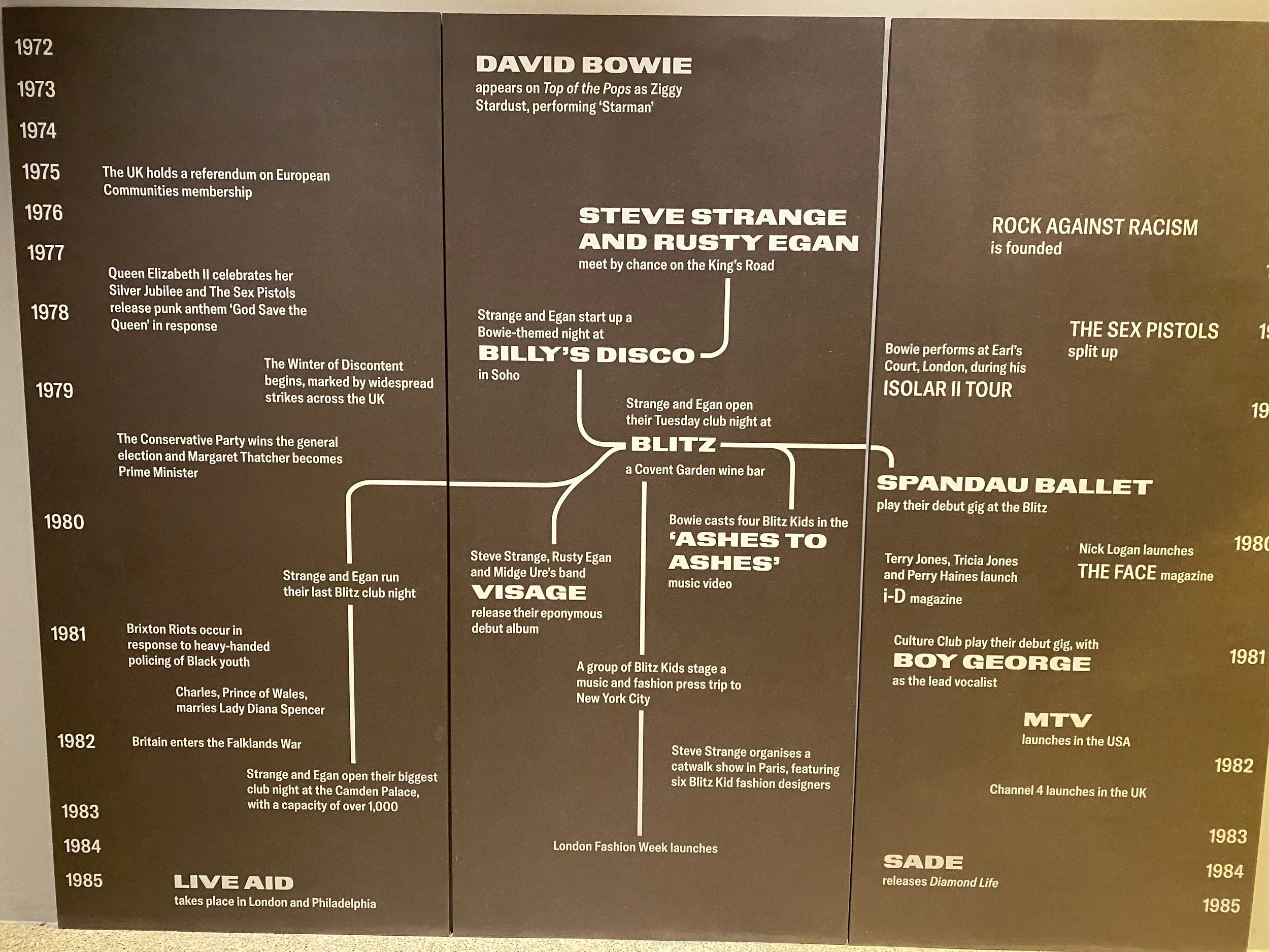 The show plots how the Blitz scene was born out of the economic and political turmoil of late 1970s Britain. Drawn from working class council estates and lower middle-class suburbs, the regulars took advantage of cheap rents and squats in central London; free university tuition and late-night buses. Kicking against drab consumerism and conventional youth culture, they were inspired by the restless creativity of David Bowie; by the experimentation of European avant-garde cinema and the sedition of punk; by the glamour of the soul scene and the transgression of drag acts and cabaret.